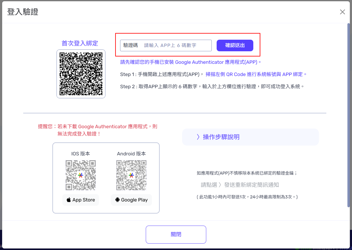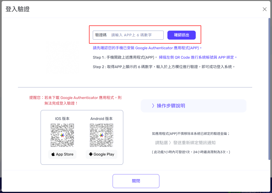 將 APP上的 6 碼數字 ( 每30秒更新 ) 輸入進行驗證 ,即可成功登入系統。