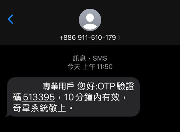 OTP 驗證碼,輸入於驗證碼畫面 ( 有效時間10分鐘 )。